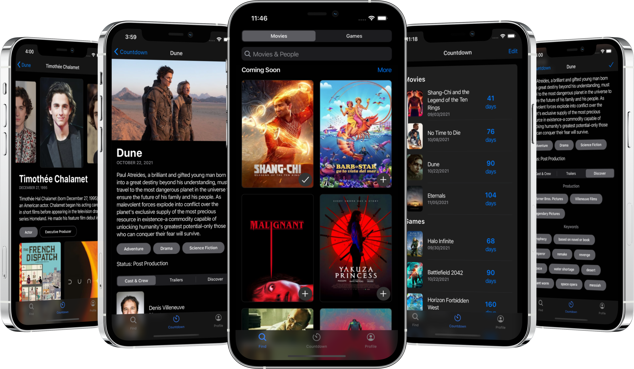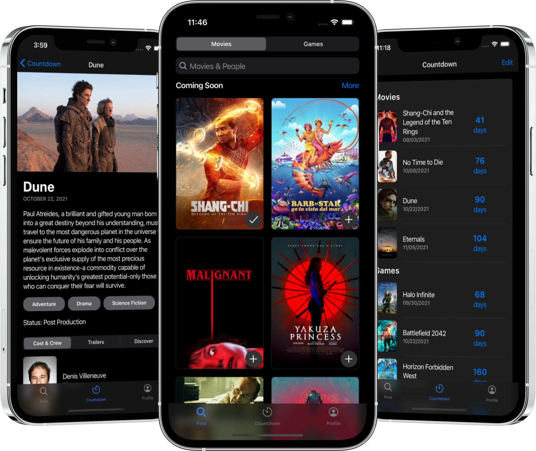 Movie and game release tracker for iOS and Android with a simple interface, optional push notifications for upcoming releases, and powerful discovery tools.