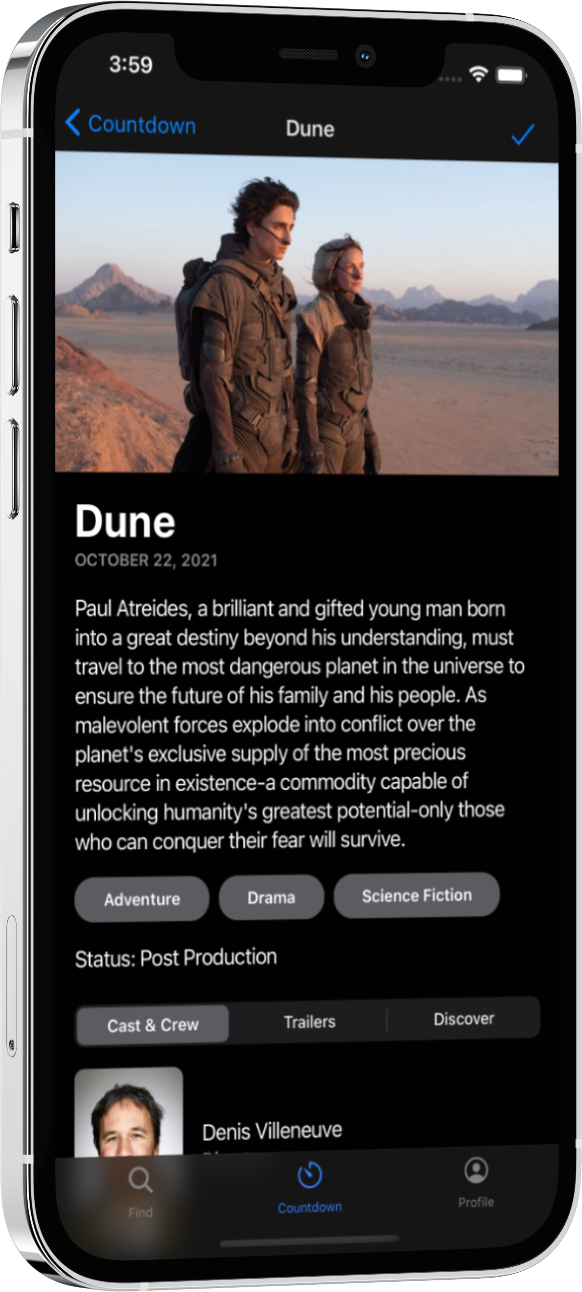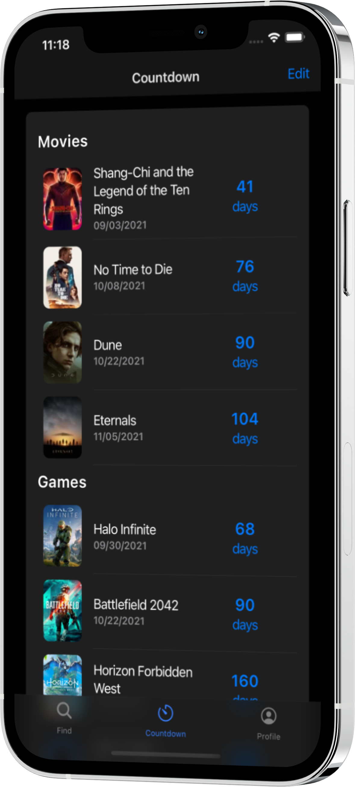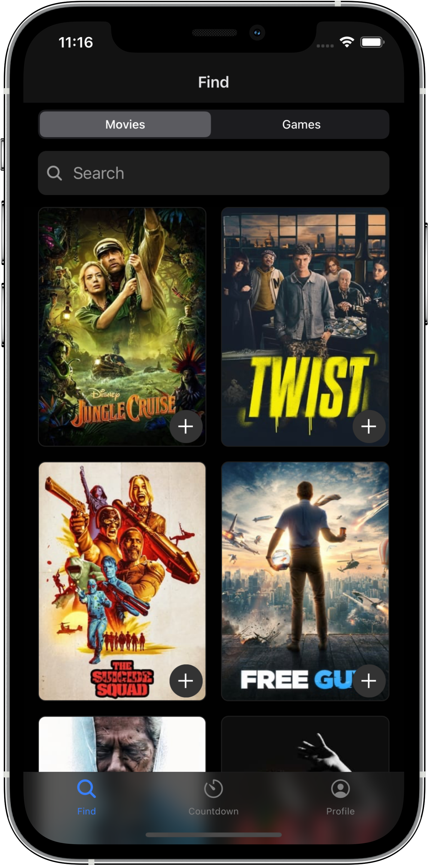 You can't add movies and games to your Countdown list if you can't find them easily. That's why the Find tab shows large posters for upcoming releases and an easy to use searchbar where you can search for a title.